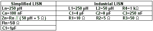 Various LISN topologies are available to comply with the normalised impedance. To each topology corresponds a set of different component values.