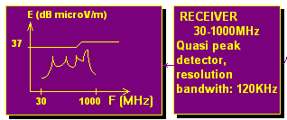 Such measurements are neither possible in the FM (88 to 108MHz) nor in the Television frequency range. Indeed, the levels of these emitters are far higher than the standards. Another problem in this kind of test site, is the disturbance caused by undesired sources (such as vehicles in the vicinity). Consequently, measurement can be made in a Anechoic chamber (See chapter 3.3 'Susceptibility'), but distances must be reduced, since a big chamber would be too expensive. |