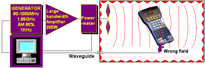 A problem remains : The device under test can modify the field distribution in the anechoic chamber. This leads to incorrect field values, since the field-meter near the apparatus is in the disturbed zone. Measurement is thus achieved in two steps. |