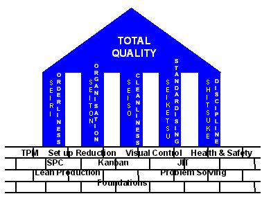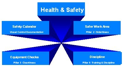 The concept of the visual workplace is supported by the five pillar system which origionated in Japan. Due to each of the pillars having a name which began with the English 'S' sound, the system has been adopted as the 5S.