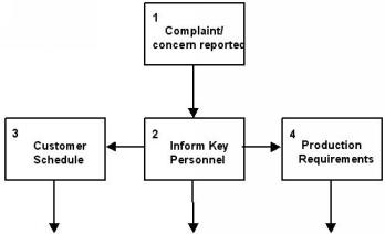 |  |   | 1. Complaint/ concern reported 2. Departments generally informed; Quality, Logistics, Customer Liaison and relevant manager. 3. Ensure customer schedule not at risk and if any suspect parts in transit. 4. Assess effect on in-house production. |