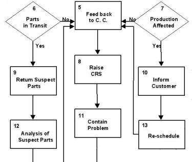 |  | 5. Feed back to C.C. 6. Are parts in transit? 7. Is production eafected? 8. Raise Concern Received Sheet. 9. Arrange for return of suspect parts. 10. Inform customer that delivery may be affected. 11. Contain problem in-house. 12. Analyse parts to confirm concern. 13. Re-schedule production to minimise effect on customer. | |