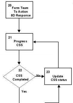 |   | 24. Feed back current status to customer. 25. Monitor CSS for set period (100 working days) for a recurrence. 26. On completion of monitoring period, the CSS is reviewed for closure. This must include all the supporting evidence. | |