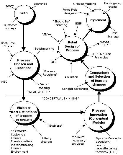 There are many techniques associated with the various stages of a BPR project. An indication is given in the figure. This figure uses the overall soft systems methodology as a framework. Notice that once the "real world" analysis has been completed, good BPR involves taking a step back. (What Davenport calls a "vision statement" and Hammer calls "starting with a blank sheet of paper")? If you don't do the conceptual stage, you are really doing work-study or a kaikaku exercise, not BPR.