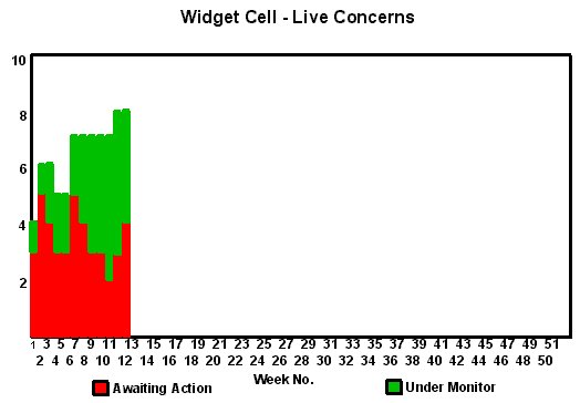 | Record of Outstanding Concerns raised against Widget Cell, showing Corrective Action Plans under investigation and CAPs being monitored to prove action taken as successful. Can also be measured as a second level Measure of Performance Ref. Concern Management |