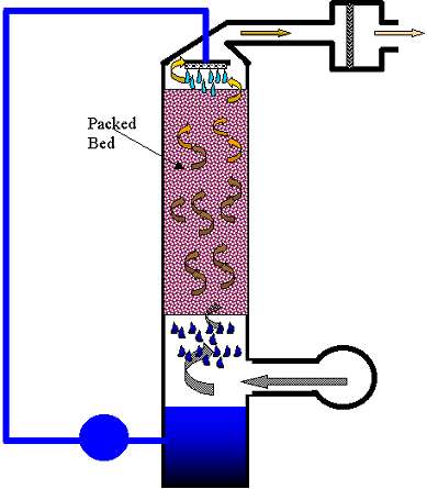 Liquid moves down through packing and gas moves up. Collection is by collision of particles on wet surfaces and by either sorption processes or chemical reaction interactions between liquid and gas phase pollutants |