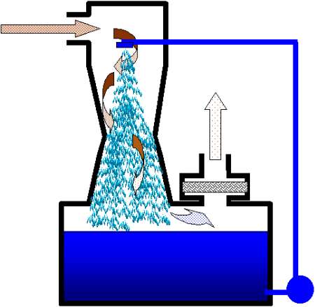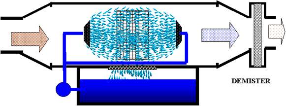 In this device the air passes through two counter flowing sprays directed at a mesh grid. The main advantage is that it can fit inconspicuously onto a flat roof. In all wet scrubbers a demister is used to remove the entrained water droplets. OR IN THE FORM OF A LOW PRESSURE DROP VENTURI SCRUBBER. | |
