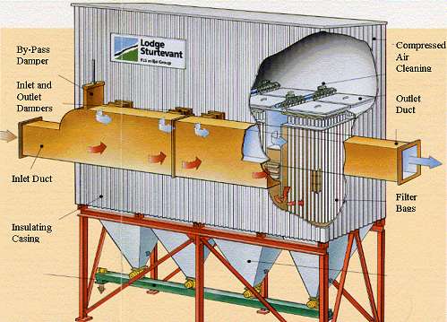 Fabric Filters (or Bag Filters) are normally operated through the use of multiple bags mounted in a BAG HOUSE. A typical bag house is shown below. |