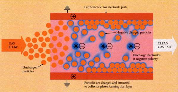 The discharge ionises gas molecules in air stream. Negative ions interact with particles, which pick up a negative charge and are attracted to plates. They discharge on contact with the plates. |
